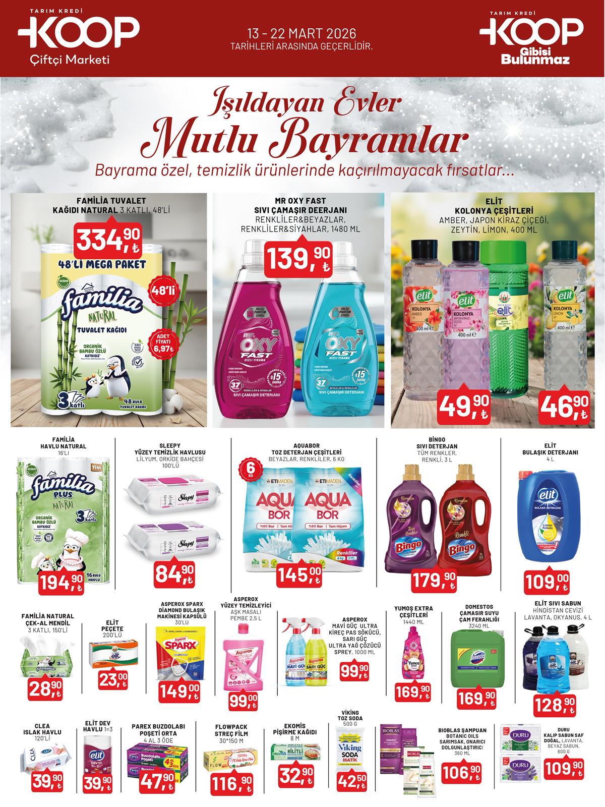 Bayram hazırlıklarının hız kazandığı Mart ayında, Tarım Kredi Kooperatif Marketleri tüketicinin yüzünü güldürecek büyük temizlik hamlesini başlattı. 13–22 Mart 2026 tarihleri arasında geçerli olacak “Işıldayan Evler Mutlu Bayramlar” kampanyasıyla; deterjandan kağıt grubuna, kolonyadan hijyen ürünlerine kadar onlarca kalem üründe fiyatlar dibe çekildi. İşte evini bayrama hazırlayanlar için raflardaki en sıcak fırsatlar ve güncel fiyat listesi.